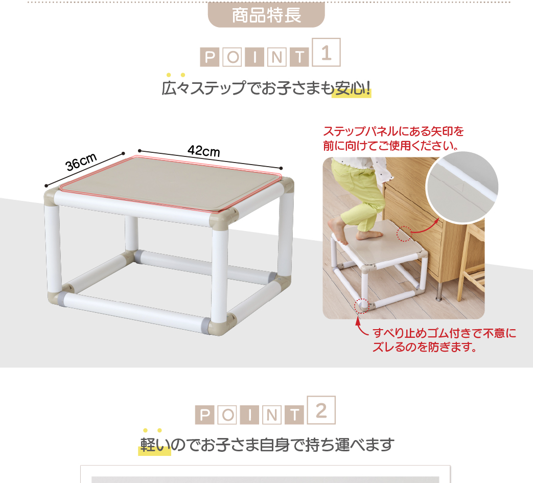 踏み台は、子供の身長にあった環境を提供して安全に生活できるようにサポートし、保育や教育現場で推奨される「子供中心の環境構成」にマッチします。