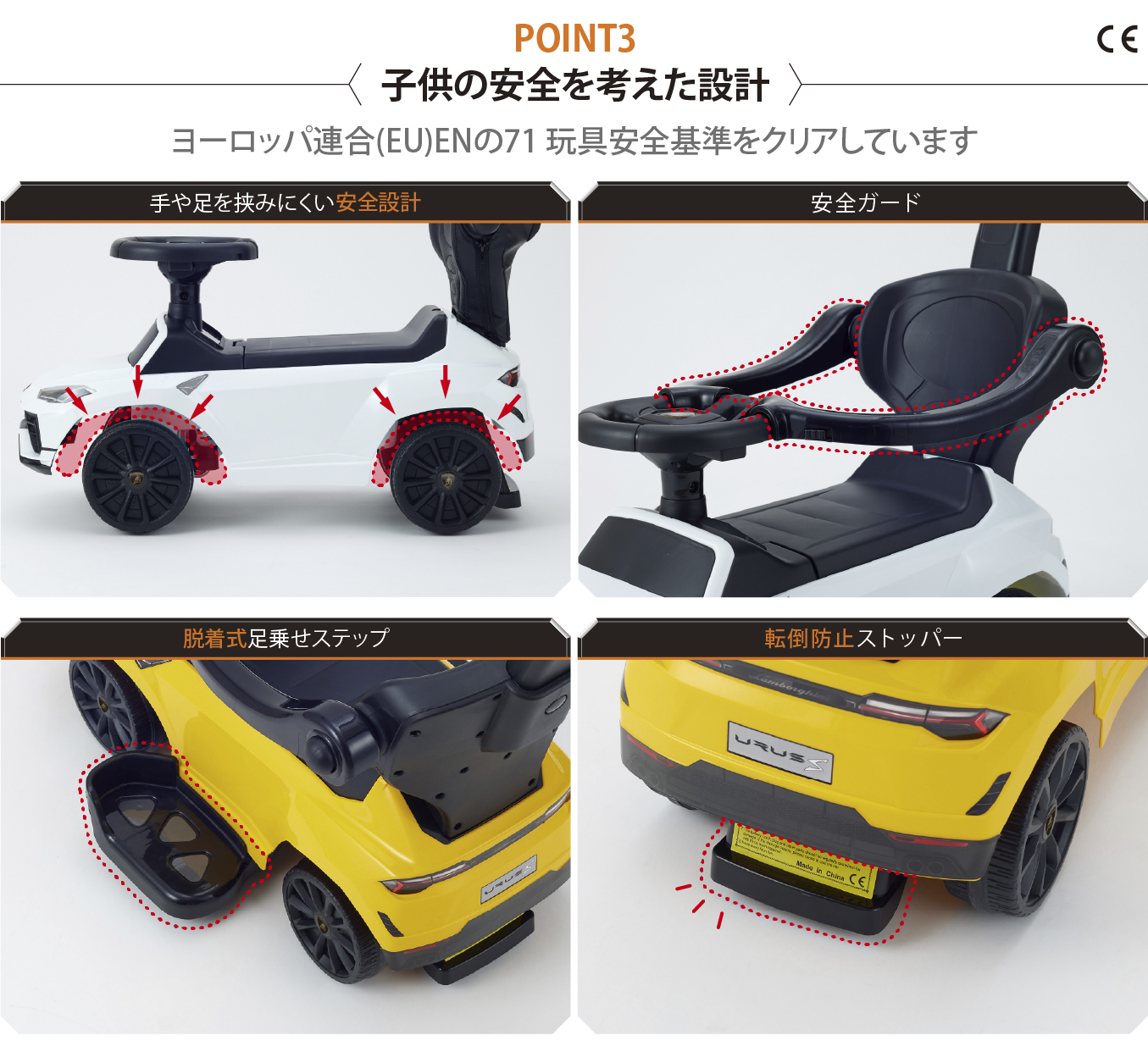 カッコいいだけじゃない、子供の安全を考えた設計でヨーロッパ連合(EN)のEN71玩具安全基準をクリアしています。