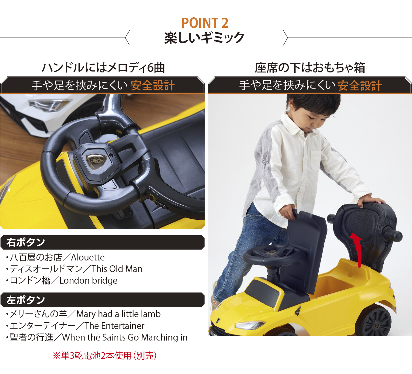 ハンドルには6曲のメロディがついてノリノリドライブ!座席の下はおもちゃ箱になっていて中には好きなものや宝物を入れられるのもイカすね!